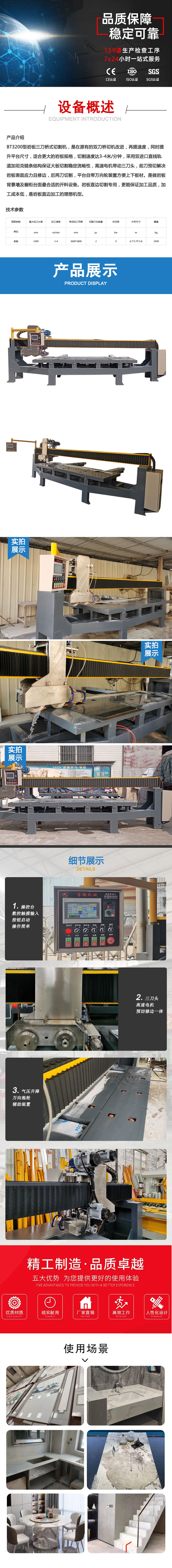 BT3200型巖板三刀橋式切割機,主要用于直邊開料切割,具有單任務(wù)或多任務(wù)的設(shè)置,可實現(xiàn)自動回刀多任務(wù)切割。省時省力,是大板巖板加工利器,可達(dá)3-4米/分鐘,采用雙進(jìn)口直線軌道加坦克鏈條結(jié)構(gòu)保證大板切割穩(wěn)定流暢性,高速電機帶動三刀頭,前刀預(yù)切解決巖板表面應(yīng)力且修邊,后兩刀切割,平臺自帶萬向輪裝置方便上下板材。是做巖板背景墻及櫥柜臺面最合適的開料設(shè)備。巖板直邊切割專用,更能保證加工品質(zhì),加工成本低,是巖板直邊加工的理想機型。