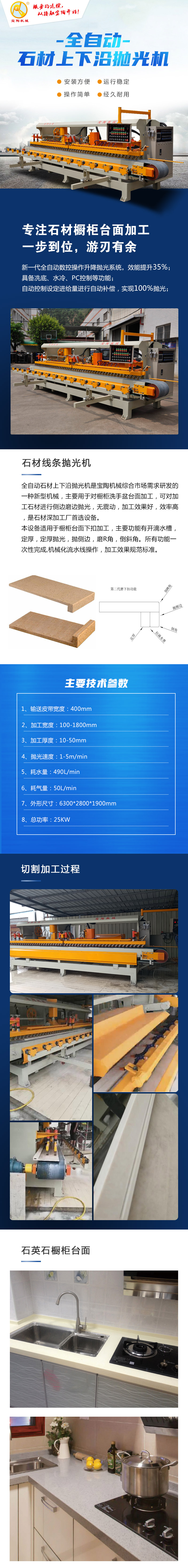 本機配置為 1個修直邊、6個拋直邊, 1個定厚、2個定厚拋光, 1個開滴水槽,2個上面R圓弧拋光, 6個下面R圓弧拋光。可進行臺面上下小圓角、定厚、定厚拋光、倒斜角、開止水槽、側面拋光一次完成;一分鐘一米左右。 整體光潔度高、效率高,輸送帶傳動,適合流水線作業。石英石櫥柜臺面加工設備的首選設備。