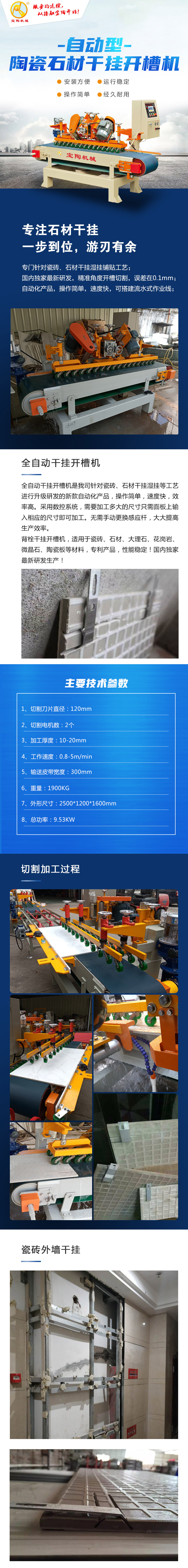 BT-1200型全自動(dòng)瓷磚干掛開槽機(jī)是我司針對(duì)瓷磚、石材干掛濕掛等工藝進(jìn)行升級(jí)研發(fā)的新進(jìn)自動(dòng)化產(chǎn)品,操作簡(jiǎn)單,速度快,效率高。采用數(shù)控系統(tǒng),需要加工多大的尺寸只需面板上輸入相應(yīng)的尺寸即可加工。無(wú)需手動(dòng)更換感應(yīng)桿,大大提高生產(chǎn)效率。