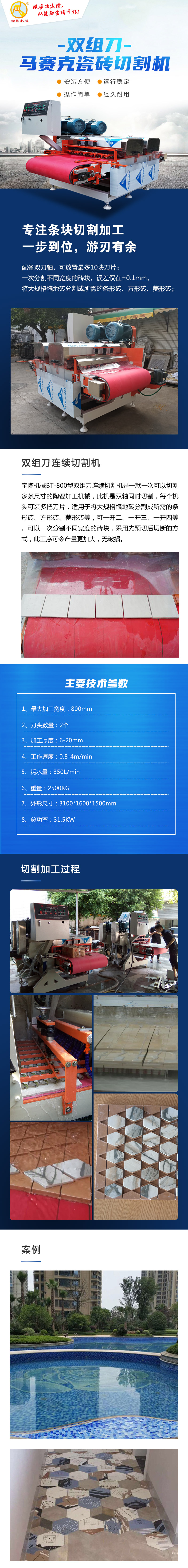 BT-800型雙組刀自動切割機(jī)適用于用拋光磚分割成各種規(guī)格的高檔馬賽克,尺寸最小可分割10mm×10mm及各種形狀,如菱形、六角型等,分割中可同時(shí)進(jìn)行倒面角,完全不需要人手再加工,本機(jī)具有機(jī)械性能穩(wěn)定,在分割小形馬賽克時(shí),可壓穩(wěn)磚塊,確保分割開的小形磚塊不會飛出及效率高,質(zhì)量好等特點(diǎn)。
