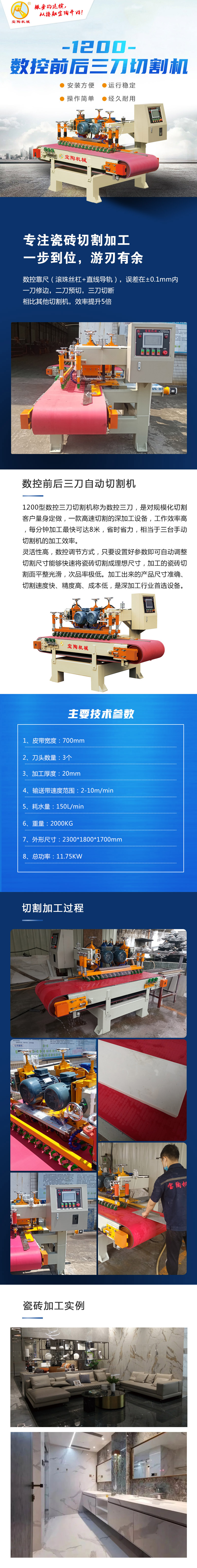 1200型數控前后三組刀切割機俗稱為數控三組刀,是對規模化切割客戶量身定做,一款高速切割的深加工設備。最大可切割1.2米(1.2米瓷磚可對開成1200*600mm);有輸送帶流水線式自動批量切割,切割速度快;采用數控調節尺寸,精度高,誤差在0.1mm以內;采用三刀頭結構,不崩邊,切割帶修邊一次性過,直接切割出原廠邊效果,無需二次加工,更省事;效率是手推切割機的4倍。適合大批量瓷磚切割加工。