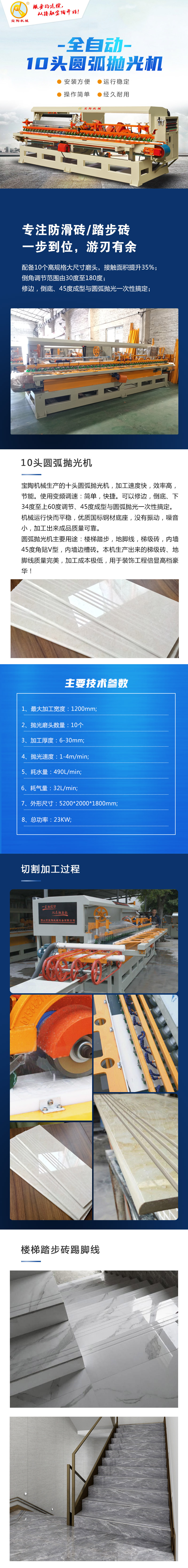 BT-1200型十頭圓弧拋光機,加工速度更快,效率更高,更節能。使用變頻調速:簡單,快捷。可以修邊,倒底、下34度至上60度調節、45度成型與圓弧拋光一次性搞定。機械運行快而平穩,優質國標鋼材底座,沒有振動,噪音小,加工出來成品質量可靠。14個大磨頭高速拋光,加工成本低,保養維護方便。
