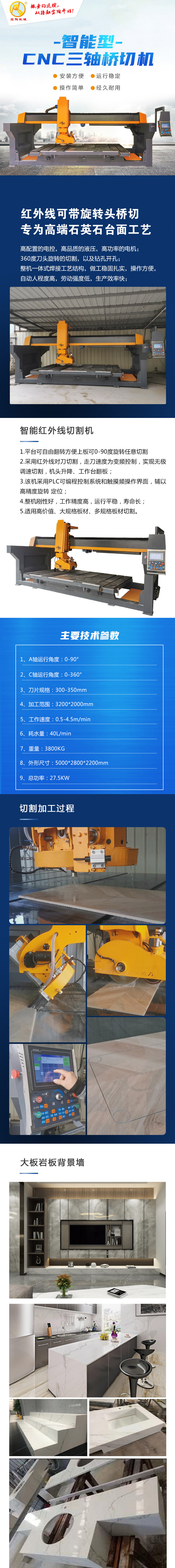 多功能3軸橋式切割機,可切斜角、直線、切割盆孔、鉆孔等臺面加工的多個工藝,一臺機器全部完成,該機還具備吸板、拍照等功能。實現了臺面板一體化加工,從橋切切板、成型、開臺盆孔、鉆孔、打磨拋光全部工序加工都完成,實現了臺面板加工的機械化、自動化。臺面板加工中心,既可以切割不同厚度石材板材,又可以完成臺面板的鉆孔、邊的成型、打磨拋光等工作,生產效率高、產品質量好。解決了臺面板人工打磨拋光的難題,實現了機械打磨拋光,使石材臺面板的加工工藝實現了革命性的突破,大大提高了臺面板的生產效率,產品質量,了降低了打磨拋光員